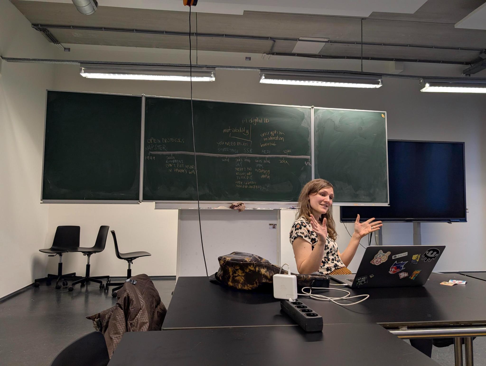 And as for my part: we neatly avoided a sammy slideshow situation (thank you doriane) and instead had a kind of guided discussion for two hours, in which we hardly talked about Willow. It was great. I had a big chalkboard behind me on which we assembled a timeline of nearly three decades of peer-to-peer trials and tribulations, from Napster’s legal dismantling to the state-sanctioned deactivation of Apple’s Airdrop. Interjections from the rest of the room were frequent and always thoughtful, and when we finished at 19:30 it felt like we could have kept on going.