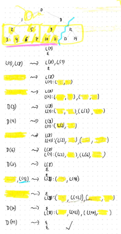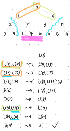 The verification state now consists of the usual verification stack (initialised to containing a single label, namely the root label, shown with an orange underline), and an additional reconstruction stack (initialised to the empty stack, shown with a purple underline). While the reconstruction step is non-empty, you also store the currently reconstructed label (shown with a green underline). Here is how these work: